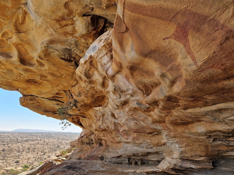 Granite outcrop where several caves display colorful paintings of human figures & cowlike animals.